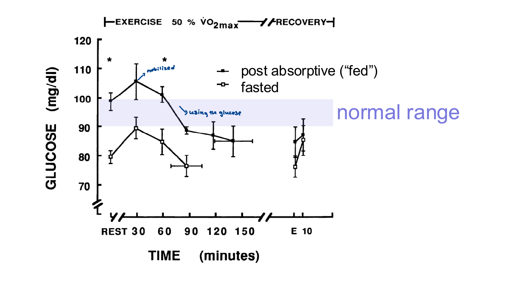 Prolonged exercise near or above LT: liver glycogen depletes, rate of gluconeogensis decreased dut to reduced blood flow to lover â blood glucose levels decrease