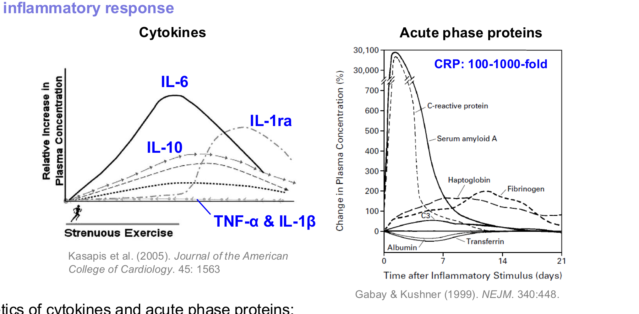 Cytokines and acute phase proteins have an increase in blood concentration in the hours to days following stimulus