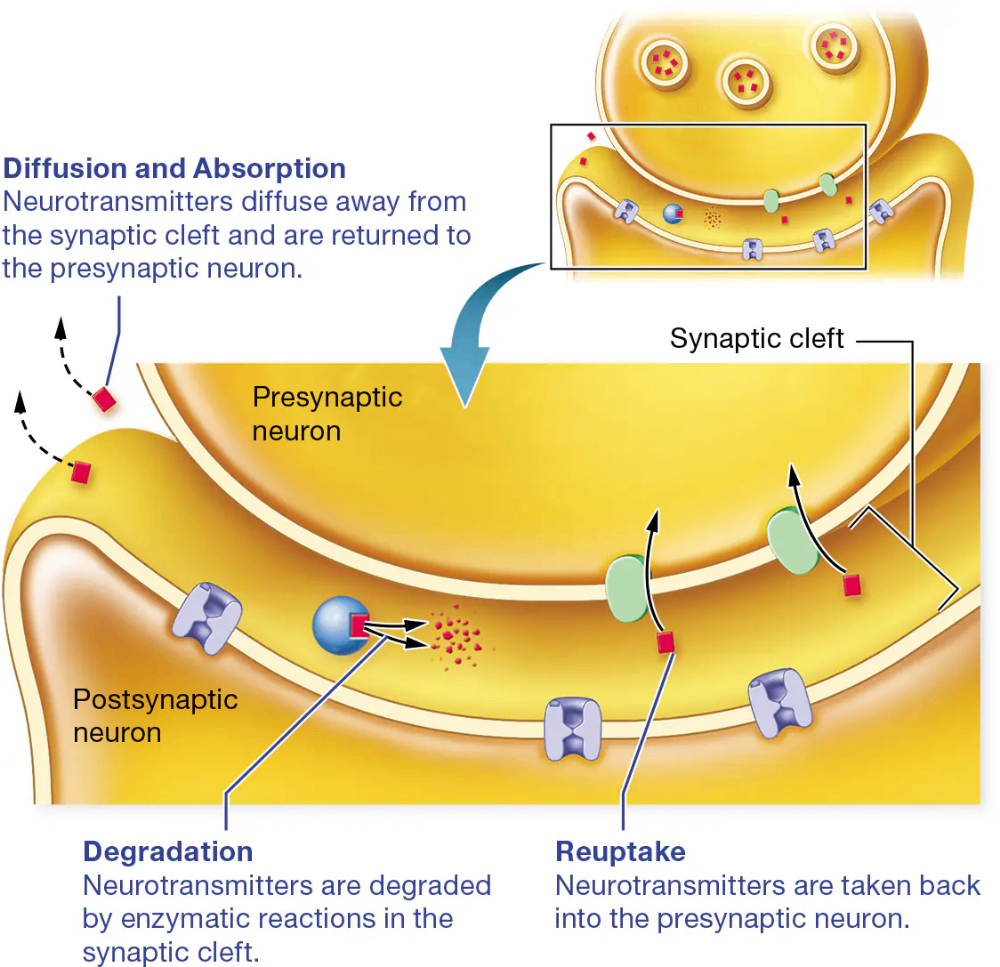 neurotransmitters diffuse away from synaptic cleft and return to presynaptic neuron