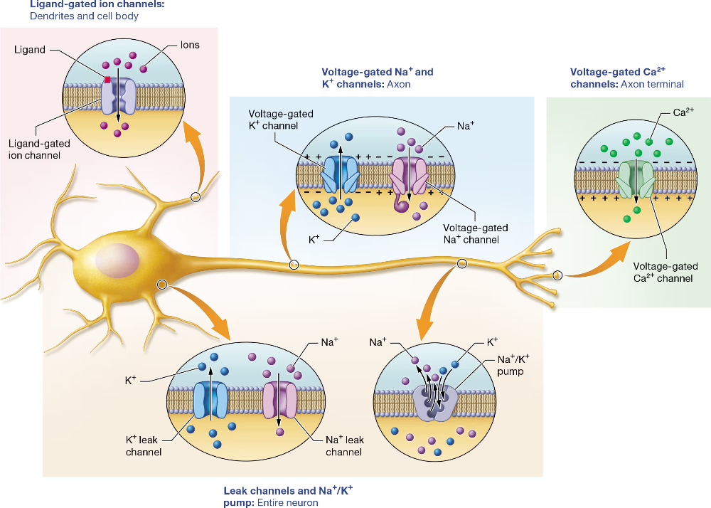 RMP applies to the entire neuron, so leak channels are found throughout every part of the neuron's membrane.