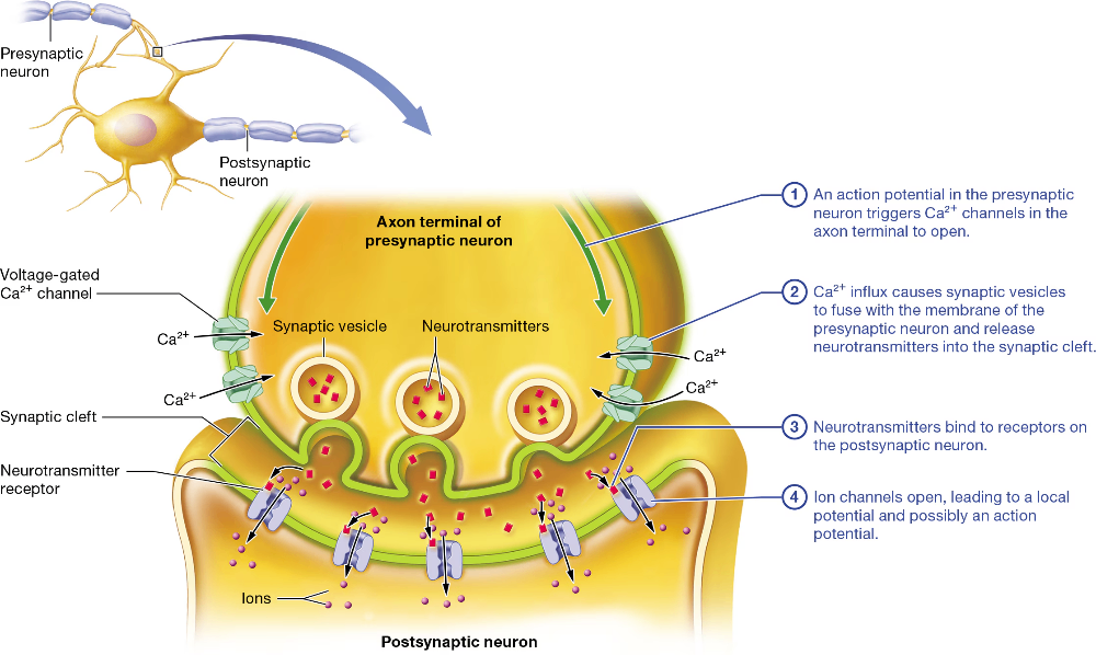 An AP reaches the axon terminal in the presynaptic neuron which triggers voltage-gated calcium ion channels in the axon terminal to open