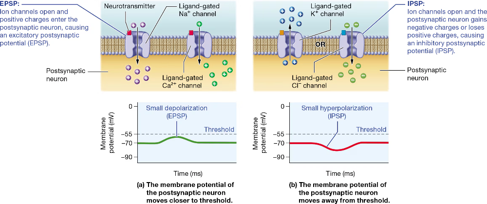 local potentials found in the membrane of the postsynaptic neuron which can move the membrane either closer to or further away from threshold