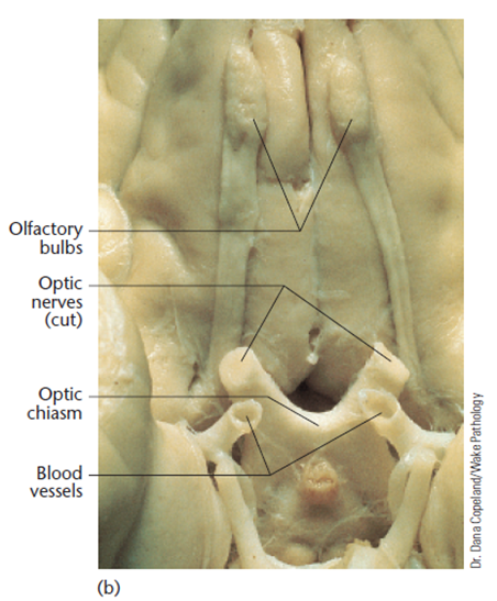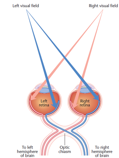 → ongeveer de helft van de axonen van het oog kruisen naar weerszijden brein bij optic chiasm