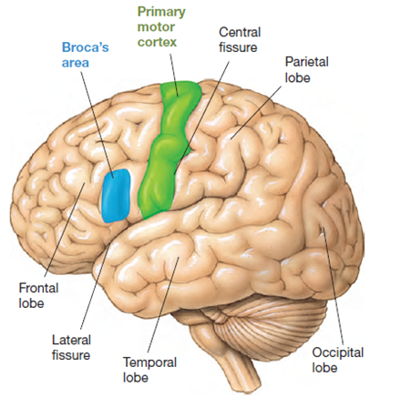 Schade aan Broca’s area in linkerhemisfeer wordt geassocieerd met afasie = tekort in vermogen om taal te produceren of begrijpen