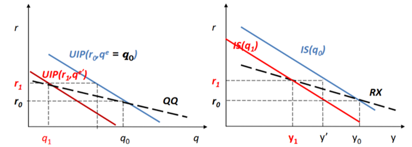 As the CB gradually cuts rates in subsequent periods, the FX market revises its expectations of appreciation downward - the UIP curve shifts back to the right each period. r falls, q depreciates back toward its original level, net exports recover, and output rises back to equilibrium as inflation returns to target. This back-and-forth is captured by the QQ line, which maps out all the (r, q) combinations along the adjustment path: r goes up then back down, q goes down then back up, and the UIP intercept mirrors this throughout since the The FX market is aware of this dynamic and their expectations mirror this.