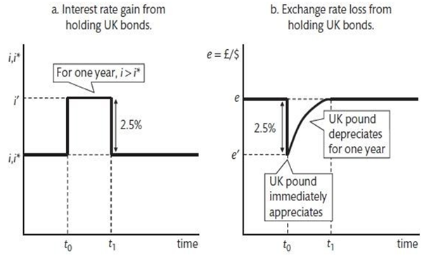 The UIP condition tells us that the interest gain from holding UK bonds over US bonds = the loss from the expected UK currency depreciation against the US’.
