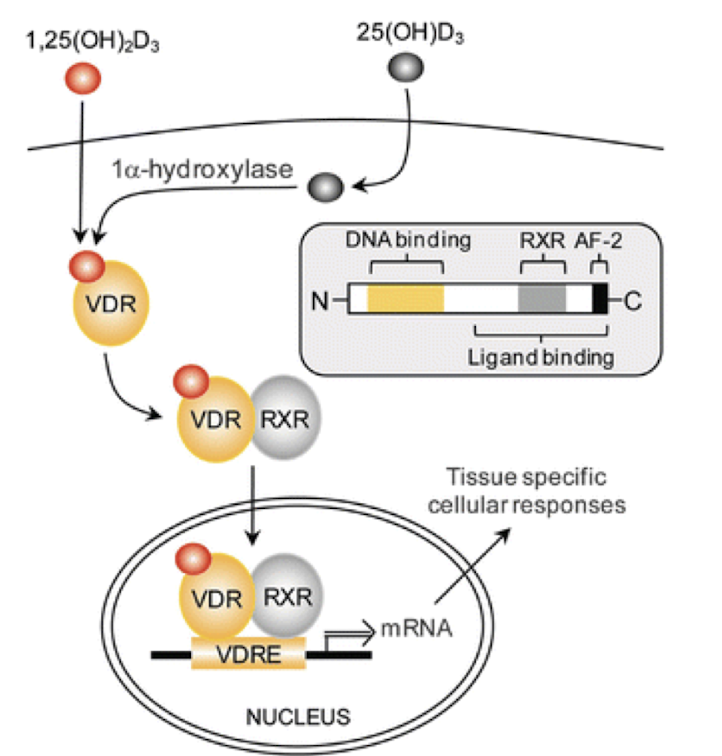 Formation of VDR-RXR heterodimers bind to Vit D responsive elements (VDREs) on DNA