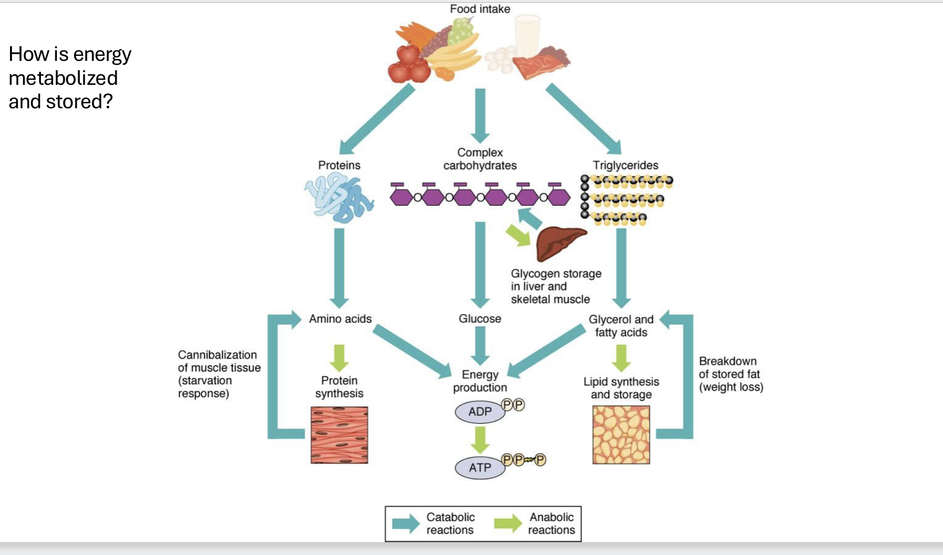 protein synthesis, energy production, lipid synthesis and storage