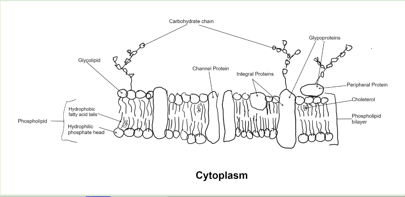 Integral proteins contain a hydrophobic section (within the fatty acid tails) and two hydrophilic sections (one at each surface of the bilayer). The hydrophobic section anchors the protein within the bilayer.