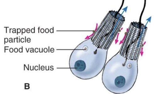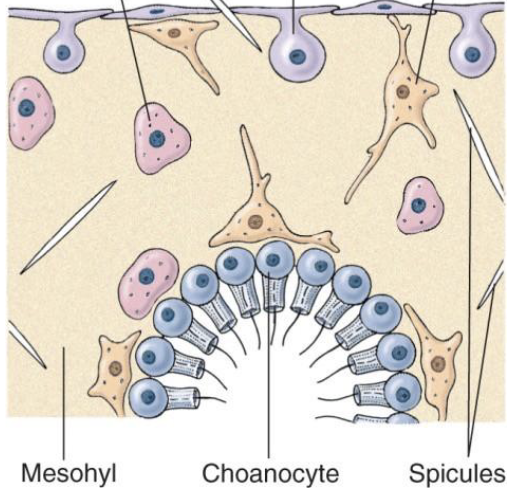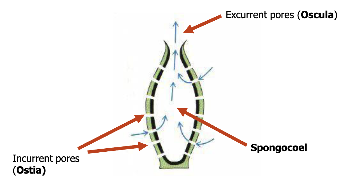 choanocyte-lined spongocoel (large, central, water-filled cavity within a sponge where water enters, flows over choanocytes, and then exits through a larger opening called the osculum)