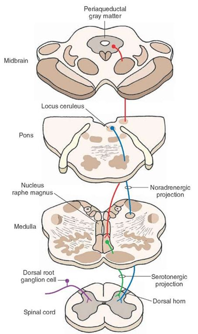 Descending pain control tracts from higher centers (e.g., hypothalamus, forebrain)