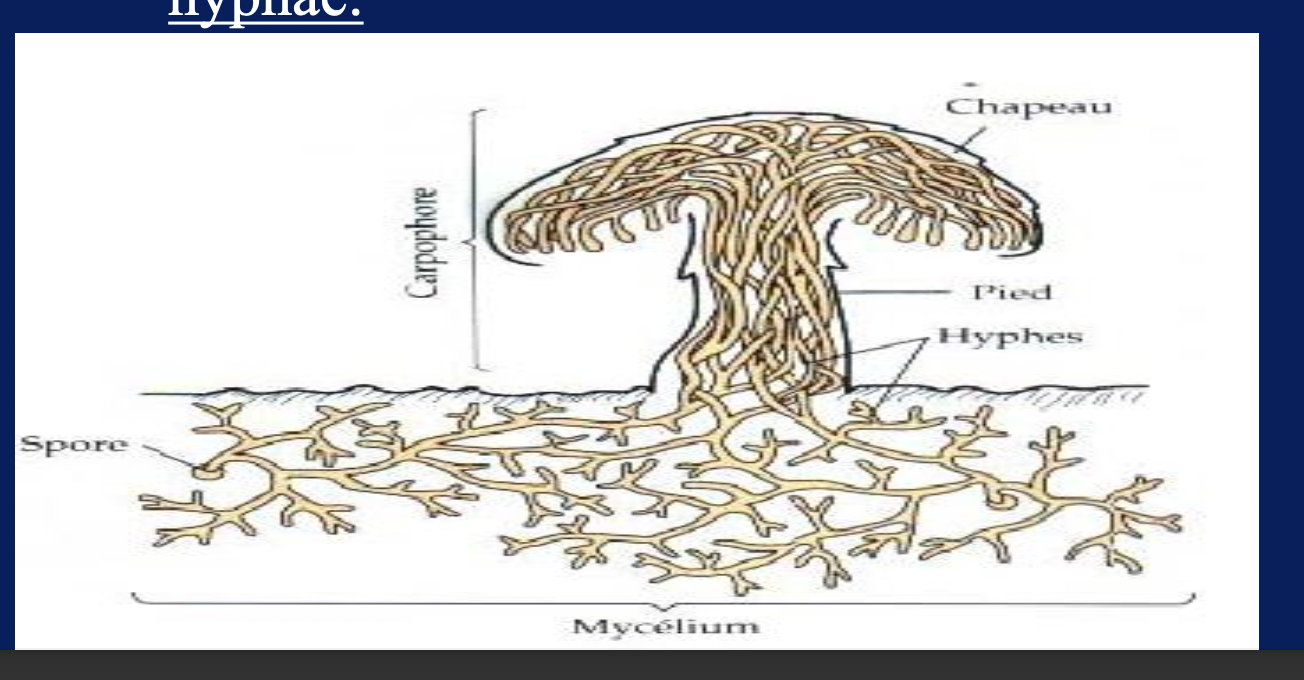 Hypha (pleural hyphae) : Microscopic branching filaments can be divided into cells by septum (septate) or non (non-septate)