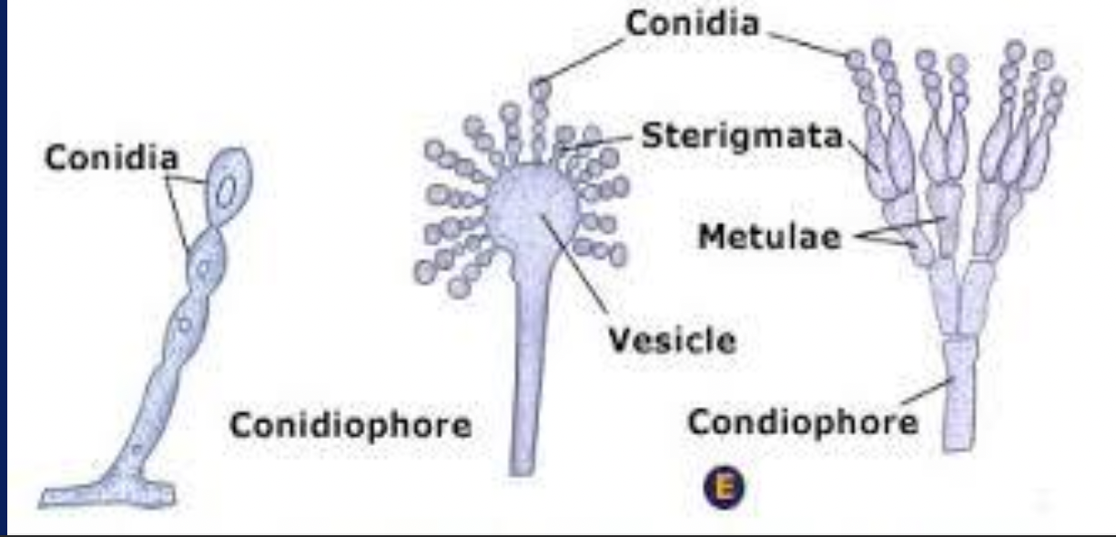 Conidium (pleural conidia) : Spore produced externally on (specialised hypha) conidiophore → becomes detached when mature → important in identification