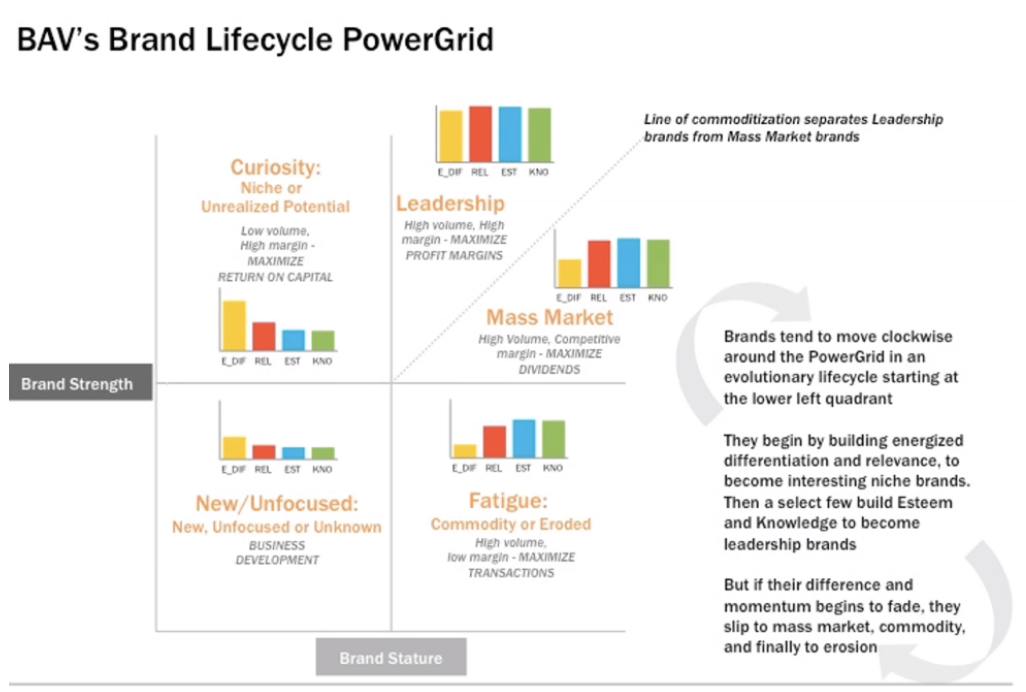 Jaké jsou čtyři dimenze v Brand Asset Valuator (BAV) a na co se dělí?