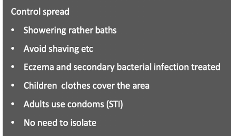 LESIONS are: 2-4mm red papules —> become vesicular and umbilicated —> breaks and crusts over leaving an eroded red base
