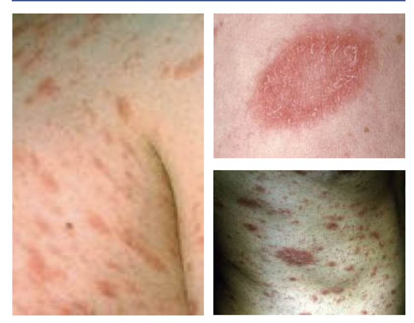 few days later, smaller plaques appear on chest n back, uncommon on face