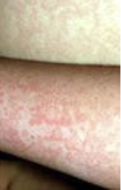 RASH: begins on trunk and spreads to face and extremities (the opposite of rubella and measles)