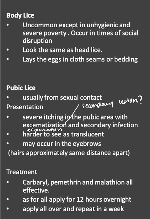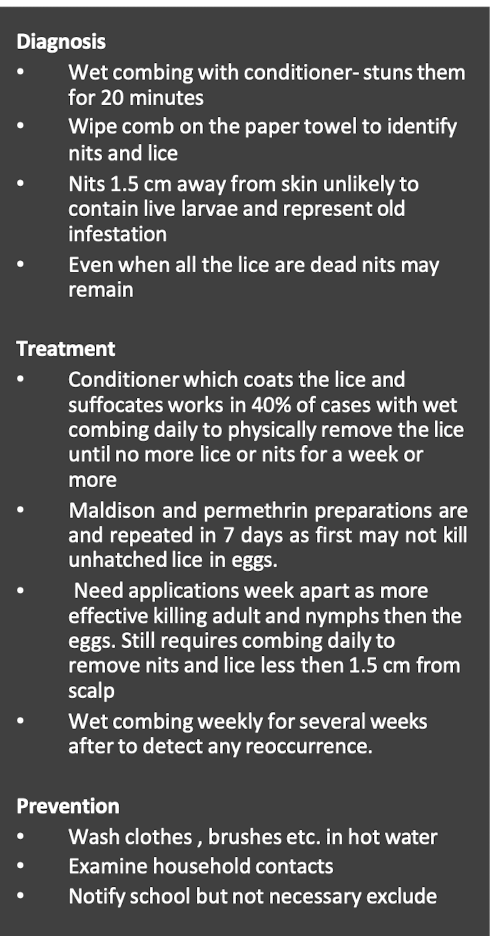 Head lice (transmission, presentation, complication, diagnosis, treatment, prevention)