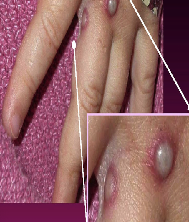 papular or nodular lesions are often seen on genitals and nipples in adults and major flexor surfaces of children