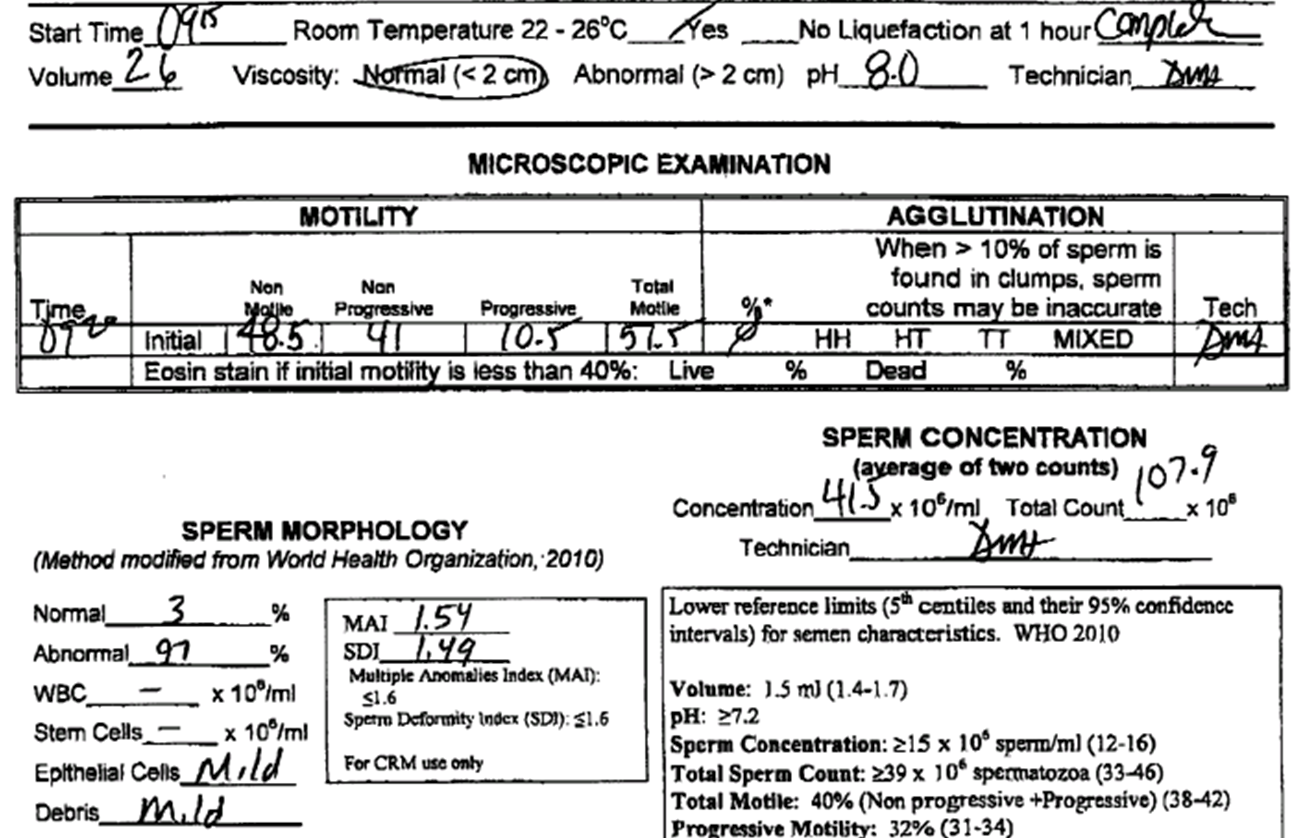 He has fathered no other children. He has not had testicular trauma. He has not been diagnosed with a varicocele in the past. Mr. Smithson denies a history of undescended testicles, chemical exposures, radiation, post pubertal mumps, and chemotherapy. He has had previous semen analysis. The results of the semen analysis were 0.3 Azoo x2.