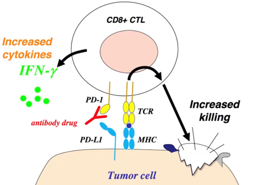 However, we can create anti PD-1 antibodies to block this signal and selectively kill the tumour cells.