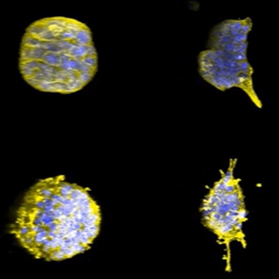 Breast epithelial cells in culture usually look round and symmetrical (top right); however, the cancerous cells are asymmetrical with lots of protrusions (bottom left)