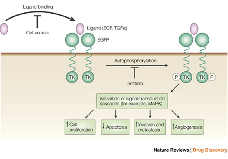 Cetuximab prevents the ligand from binding to EGFR, however, this will not work in cancer types where the mutation is in the EGFR causing it to be constantly dimerised