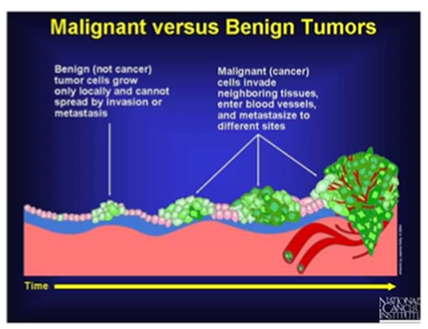 Benign – called a tumour rather than cancer. Proliferate locally and retain characteristics, have a defined boundary.