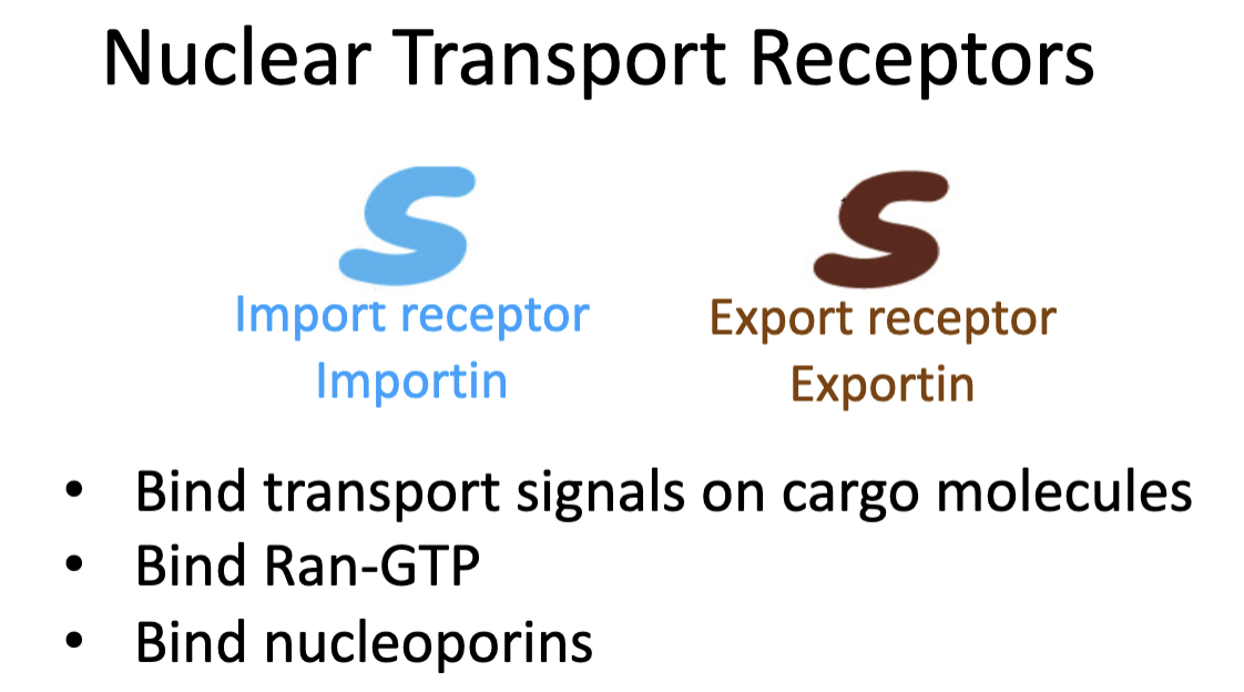 Nuclear transport receptors typically can be characterized as either import receptors called importins, or export receptors called exportins.
