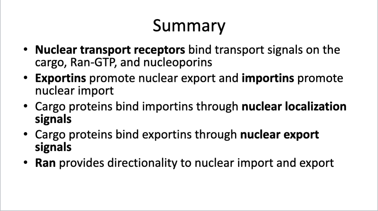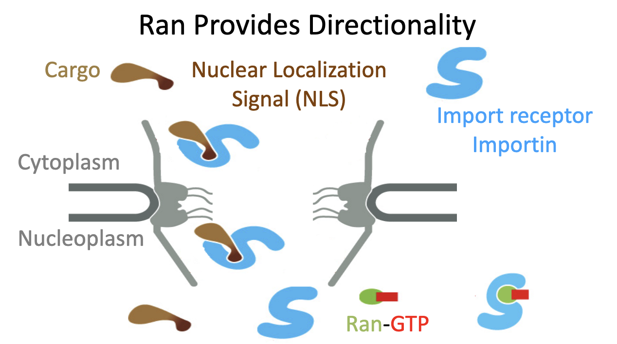 One important question that arises from this simplified model is why does the importin bind to the nuclear localization signal of the cargo protein in the cytoplasm, but in the nucleoplasm, the importin and the cargo protein dissociate from each other?