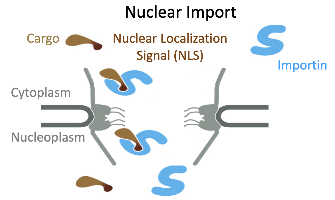 Nuclear import starts with a cargo protein with a nuclear localization signal (NLS).