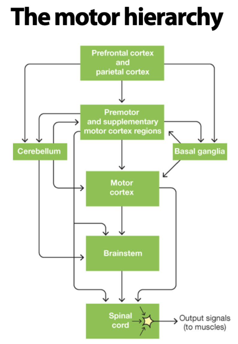 Primary Motor Cortex, Brainstem, Basal Ganglia, and Cerebellum Areas in the brain.