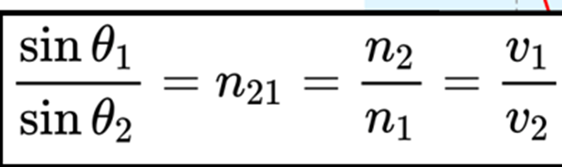 Refraction: light ray’s path is bent when it passes from one transparent material where its velocity changes.