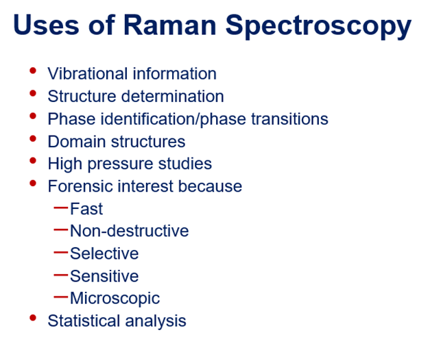 Forgery detection, as Raman spectra is a measure of particular vibrations, it is unique to a particular molecule/material. E.g., fake diamonds, jewellery.