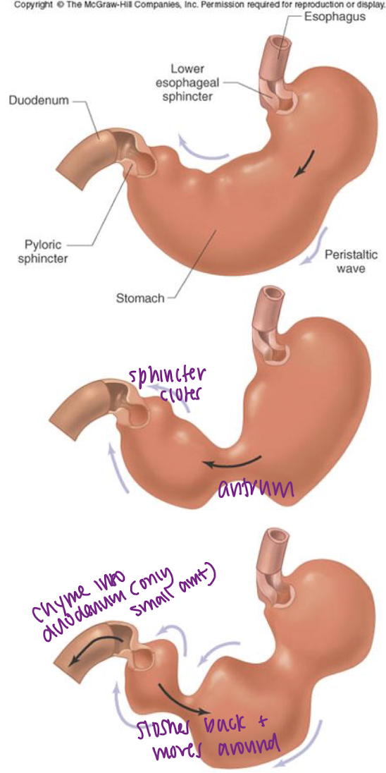 antrum has more smooth muscle, so stronger contraction. peristaltic wave closes the pyloric spincter — only a small amount of chyme enters the small intestine