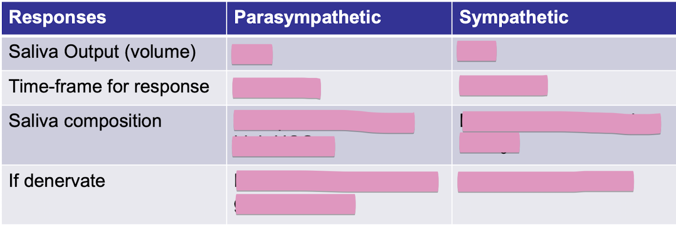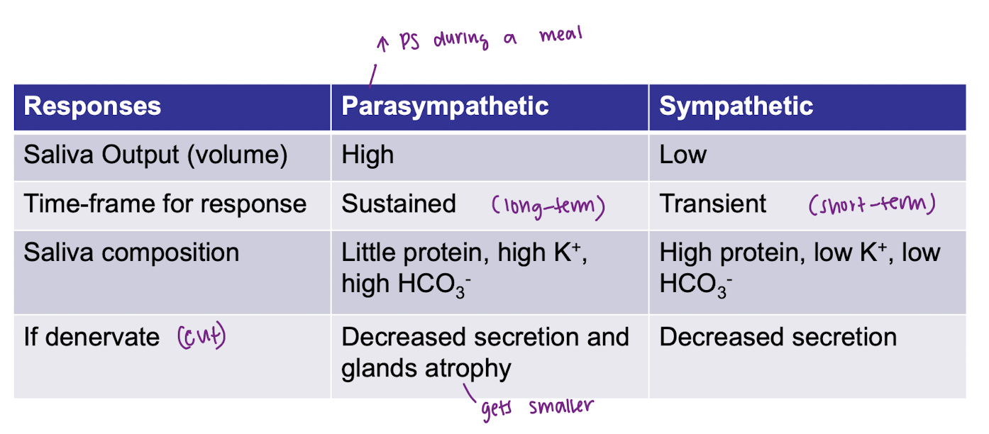 symp neurons release NE → acinar cells (α and β receptors) → increase mucin (mucous) and proteins (e.g., amylase secretion)