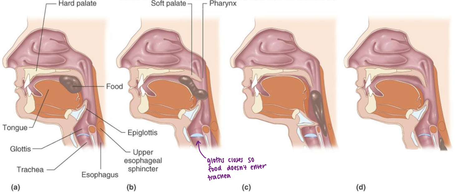 tongue pushes food to back of pharynx → reflex activated: afferent information sent to