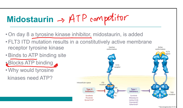 Tyrosine kinase inhibitor → blocks ATP binding to FLT3 receptor → inhibits signaling