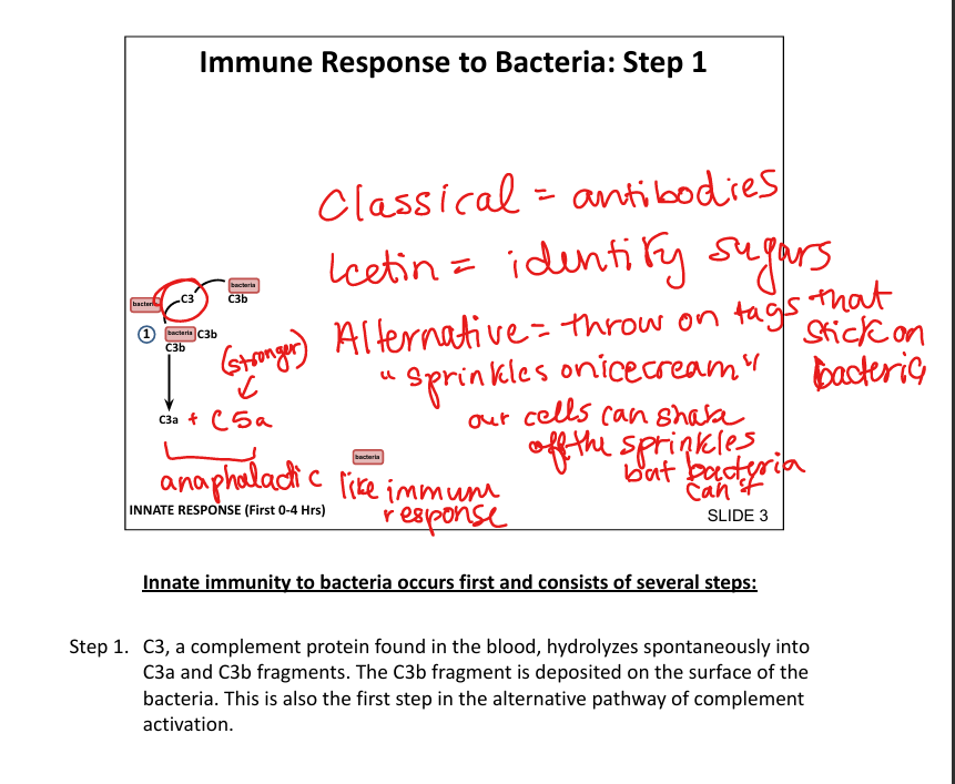 Spontaneous hydrolysis of C3 → C3b binds bacterial surface (alternative pathway»sprinkles on icecream)