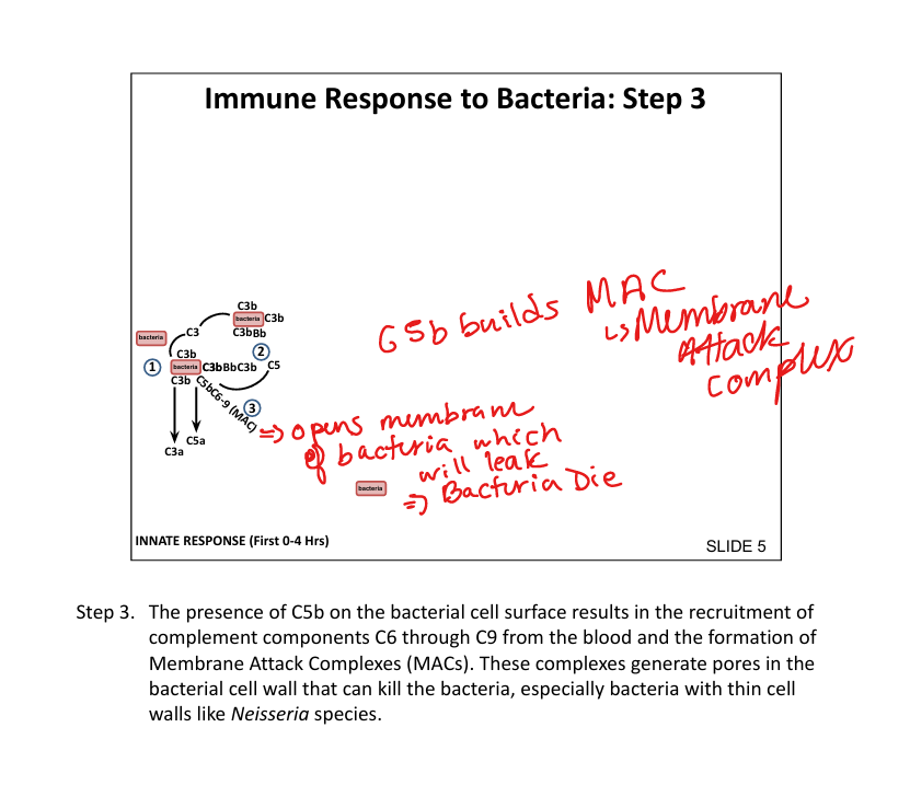 C5b + C6throughC9 → forms pore(drills a hole) in bacterial membrane → lysis (bacterial cell leaks out and dies (especially Neisseria)