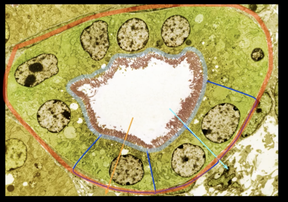lining: simple cuboidal epithelium w/ microvilli for increased surface area