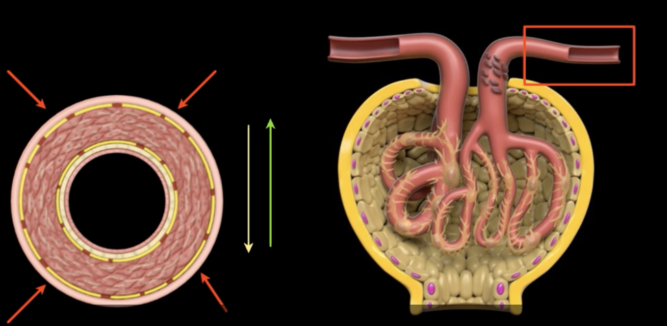 Vasoconstriction of the afferent arteriole decreases blood flow into the glomerulus…..