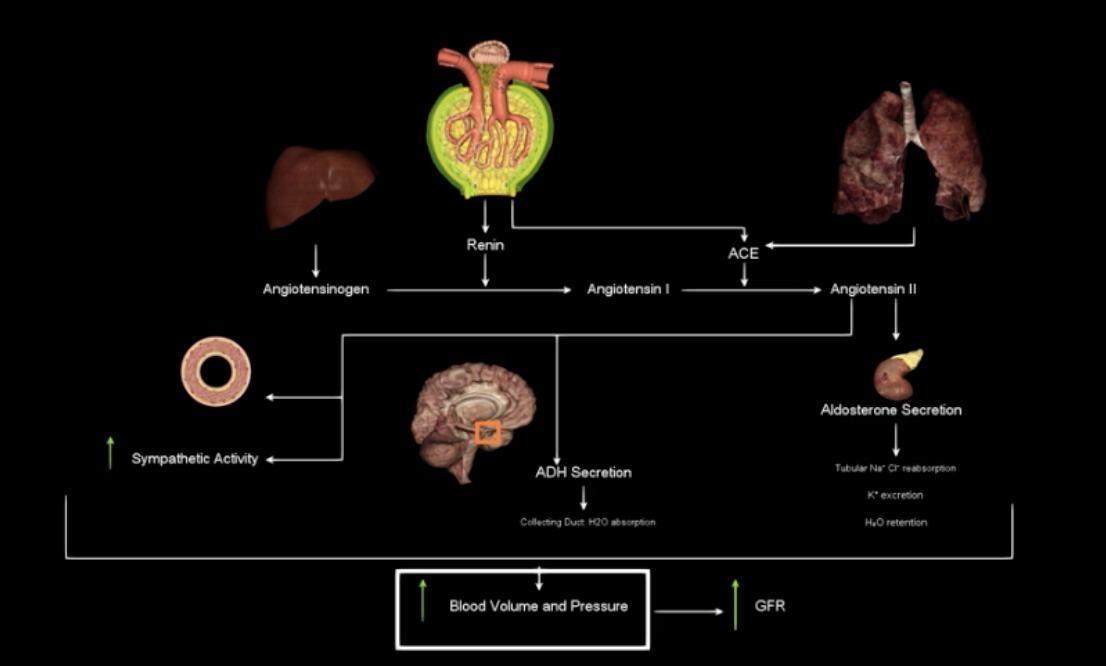decrease in GFR, and in turn increasing blood volume and systemic blood pressure