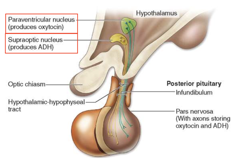 1) Axons extend from the hypothalamic supraoptic & paraventricular nuclei (PVN)