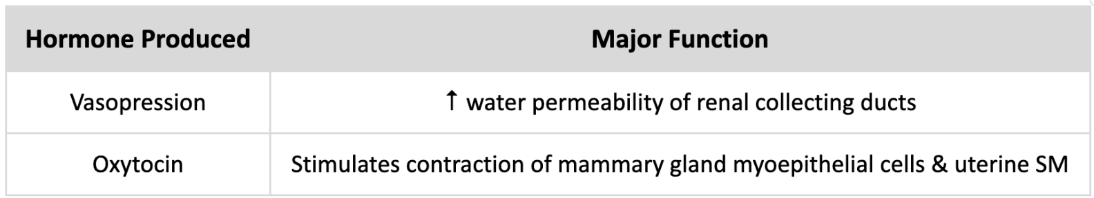 For the Posterior Pituitary, list the hormones it releases and functions. Note: It doesn’t PRODUCE these hormones.