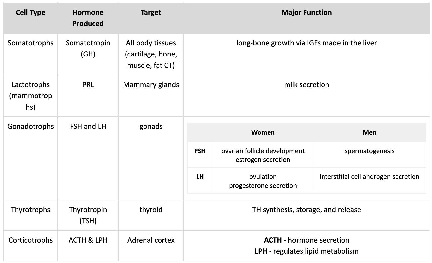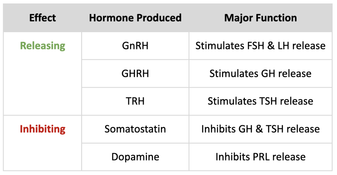 For the Anterior Pituitary, list the: