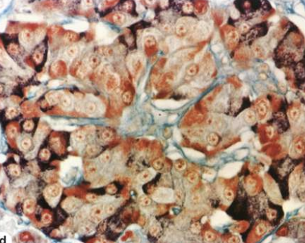Reticulin CT along the islet capsule & capillaries stains green