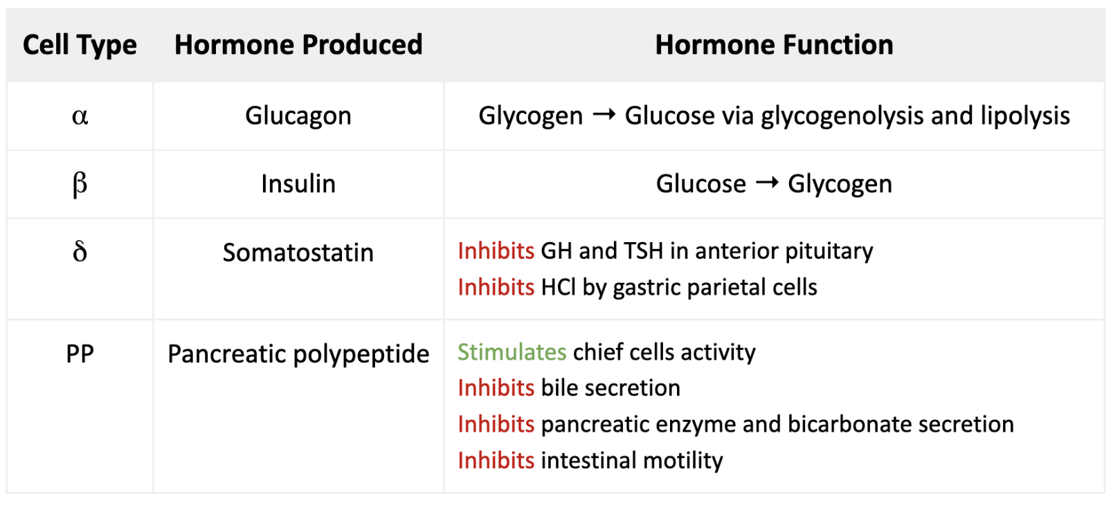 What hormone does each islet cell produce? What’s the function of these hormones?