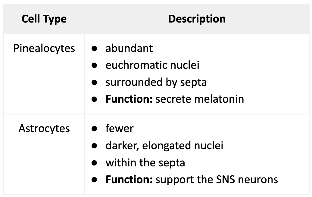 Characteristics of the cells found in the Pineal gland.
