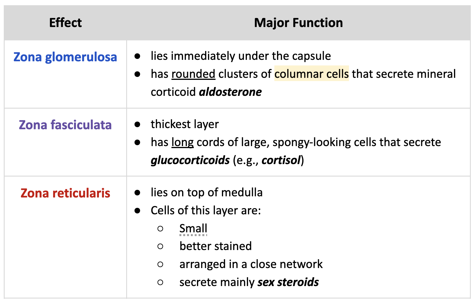 The steroid-secreting cells of the adrenal cortex are arranged into 3 concentric layers. What are they?